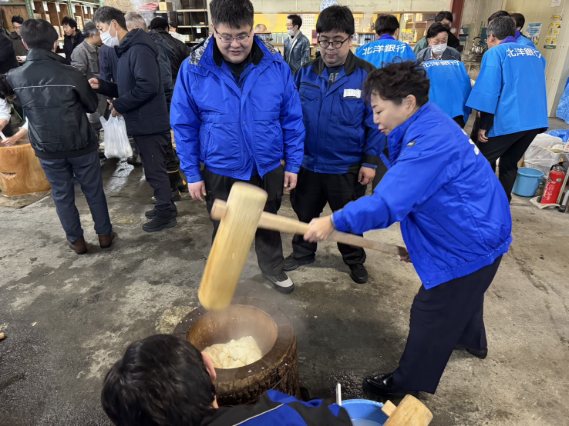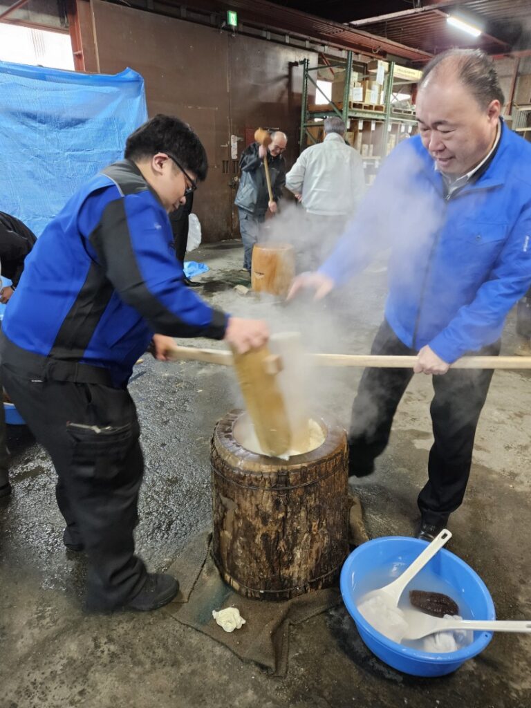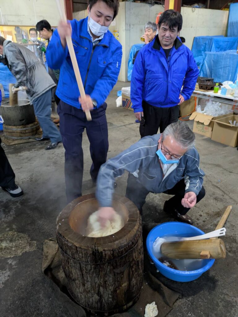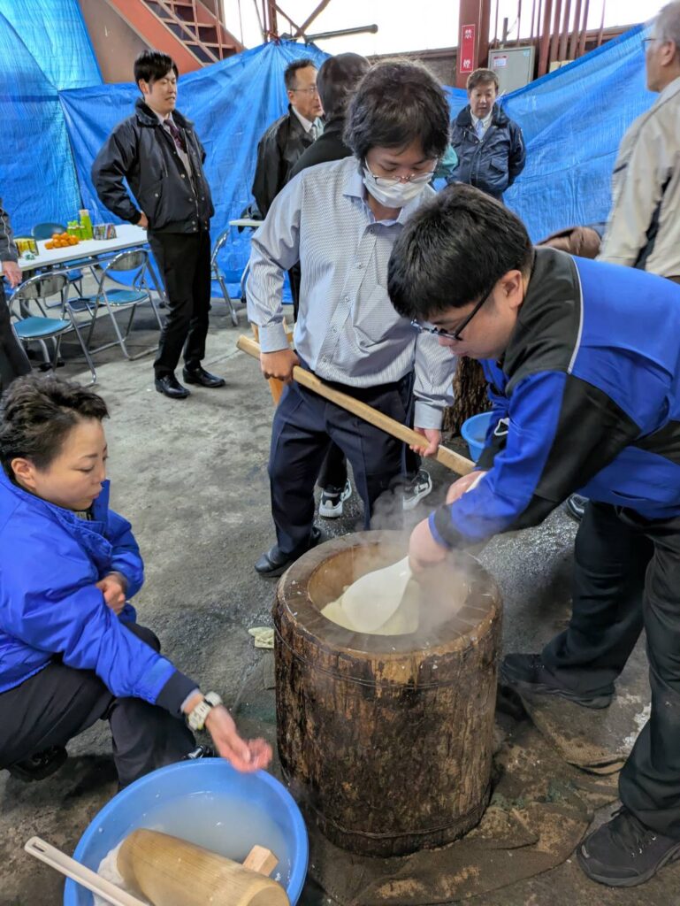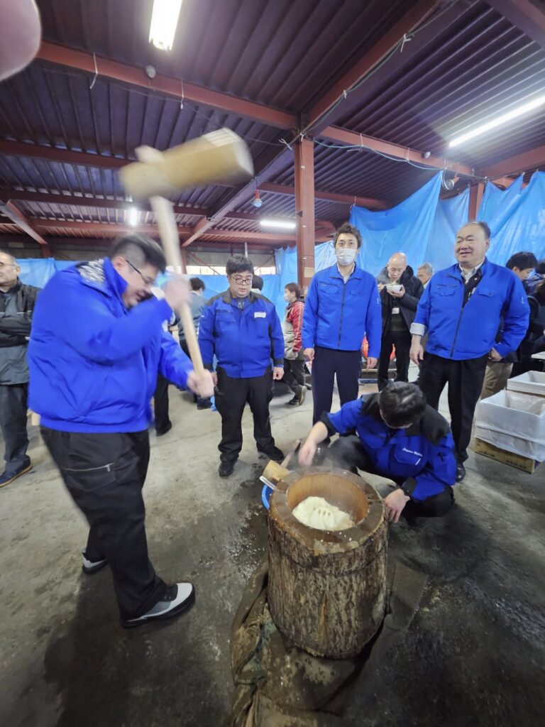 日頃お世話になる日本仮設さまの餅つきに今年は6名の参加です!!近年では目にする事が少なくなってしまった杵(キネ)と臼(ウス)を用い、日本ならではの伝統を感じます。今では高価になってしまったモチ米を6俵?!360k!\(◎o◎)/、社員さまの下準備・後片づけのご苦労などなどを振舞っていただき一年の終わり、そして来年は素敵な一年のスタートとなりそうです。お餅のように、心と心を強く繋ぐ、そんなお付き合いをいつも、いつも、本当にありがとうございます。