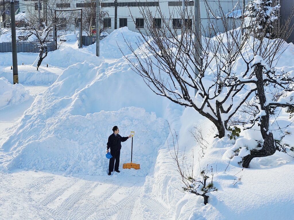 会社前、ドッサリ、もっこり雪山が札ゴム隊とショベルカーを出動~!!(社長の身長 154cm、雪山の高さは!? Wow!! 苦笑)