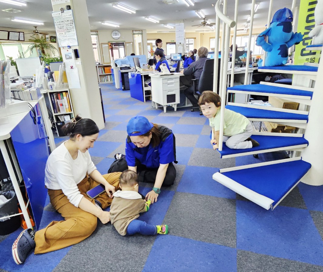 育休中の業務部ひろみちゃんと日頃親しくさせて頂いているお客さまが子供たちを連れて遊びに来てくれました♫ 事務所の中がとっても賑やか💖(●^o^●)💖 掛けっこに、お散歩に、ボール遊び・・お仕事中の方、失礼していまぁ~す・・・(笑)💦 蒼空(そら)くん、ゆうしくん、また、遊びに来てねぇ~♫ ↑ 蒼空くん 🥰💚 ↑ ゆうしくん😻💖 ゴム加工部 / プレス部門 夕子ちゃん、仕事より蒼空(そら)君に集中(笑)それを見つめる👀ゆうしくん♪